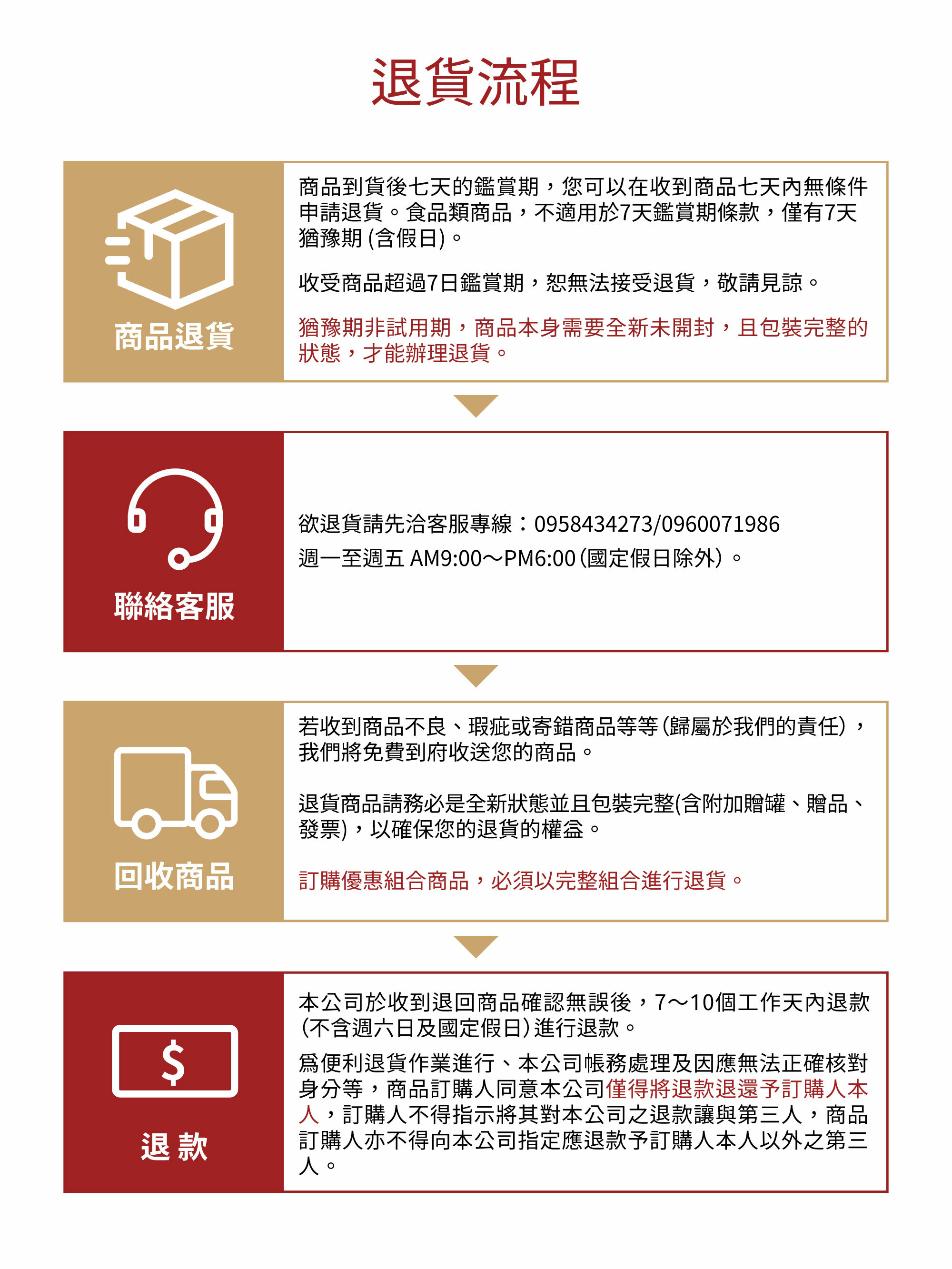 本網站除已明確標註即期品及已開封食品外,自收到商品的隔天起即享有7天商品鑑賞期(含例假日)。※請注意鑑賞期並非試用期!在收到商品經檢視後,若商品本身有瑕疵或疑慮之處而有退換貨需求,請勿拆開包裝並保持商品完整狀態,在7日鑑賞期內聯絡客服人員,並提供「姓名」、「訂單編號」、「連絡電話」、「退換貨商品名稱」、「退換貨原因及照片」等資料,客服人員將會協助您進行退換貨。