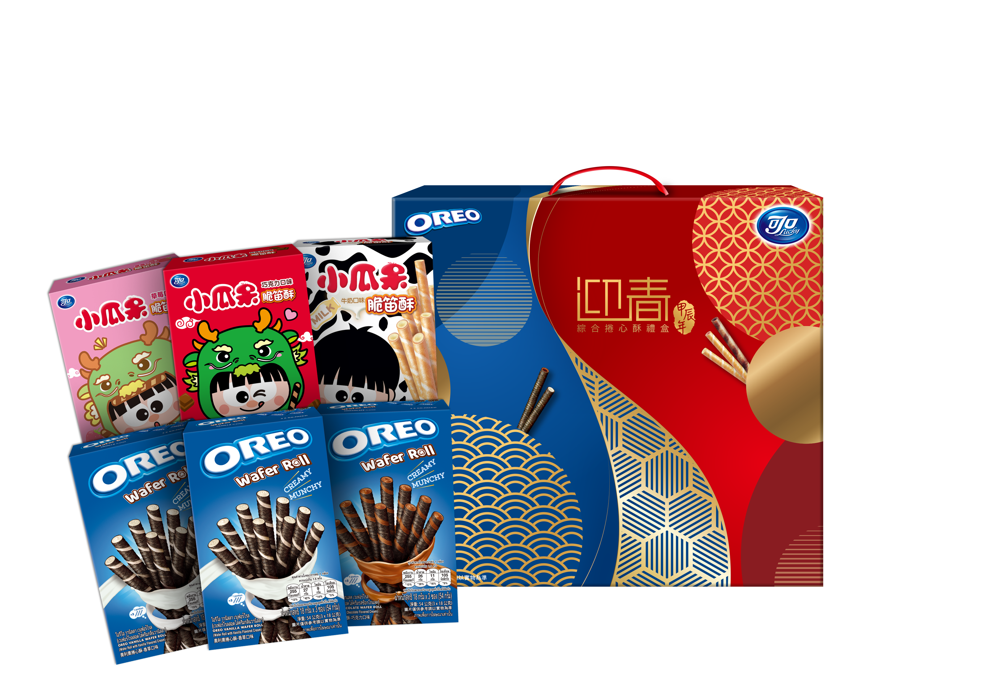 【內容物】Oreo 捲心酥-香草 54g*2 、Oreo 捲心酥-巧克力 54g、 脆笛酥-巧克力口味 65g、 脆笛酥-草莓口味 65g 、脆笛酥-牛奶口味 65g